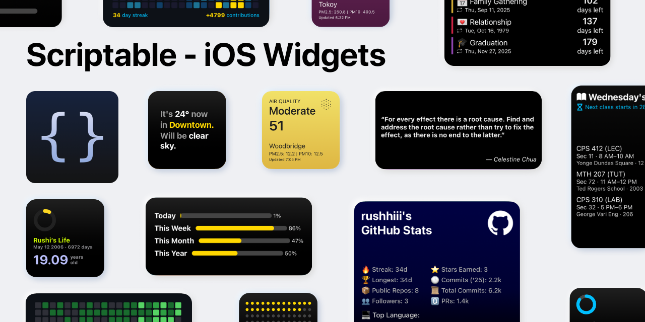Scriptable iOS Widgets is the official handbook for every widget in this repository. You will find installation steps, configuration tables, troubleshooting tips, and links back to the source code so you can confidently run each widget inside the Scriptable app.
