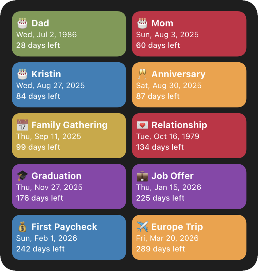 ageshows the years passed since the event date — useful for birthdays or anniversaries. If today is the event date, countdown is hidden and only age is shown.